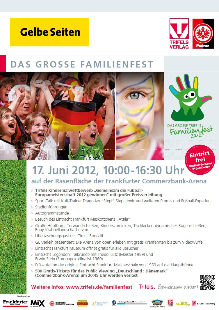 Am Sonntag, den 17. Juni ab 10:00 Uhr, sind Familien aus dem ganzen Rhein-Main-Gebiet herzlich eingeladen, gemeinsam mit dem Trifels Verlag, Herausgeber der Gelbe Seiten für Frankfurt und Offenbach, in der Commerzbank-Arena ein Fest – mit Spielen, Musik und vielen Maltischen – zu feiern. An diesem Tag findet auch das Finale des siebten Trifels Kindermalwettbewerbs mit dem Motto „Gemeinsam die Fußball-Europameisterschaft 2012 gewinnen“ statt. Weitere unterhaltsame Programmpunkte für die ganze Familie sind zu erwarten. Der Eintritt ist natürlich kostenlos!