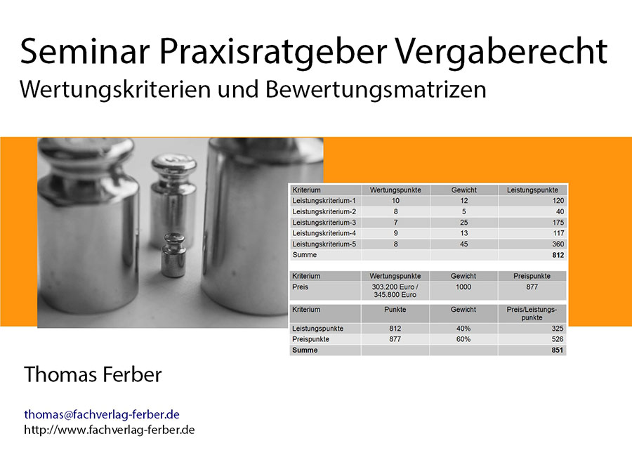 Die Buch- und Seminarreihe "Praxisratgeber Vergaberecht" des Fachverlags Thomas Ferber versteht es, das Thema Vergaberecht aus dem Paragrafendschungel zu befreien und anschaulich und realitätsbezogen darzustellen. Wer den Praxisbezug dieses eher trockenen Themas sucht, findet ihn hier.